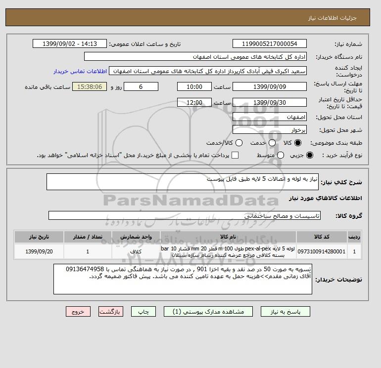 شرح کلی نیاز: نیاز به لوله و اتصالات 5 لایه طبق فایل پیوست