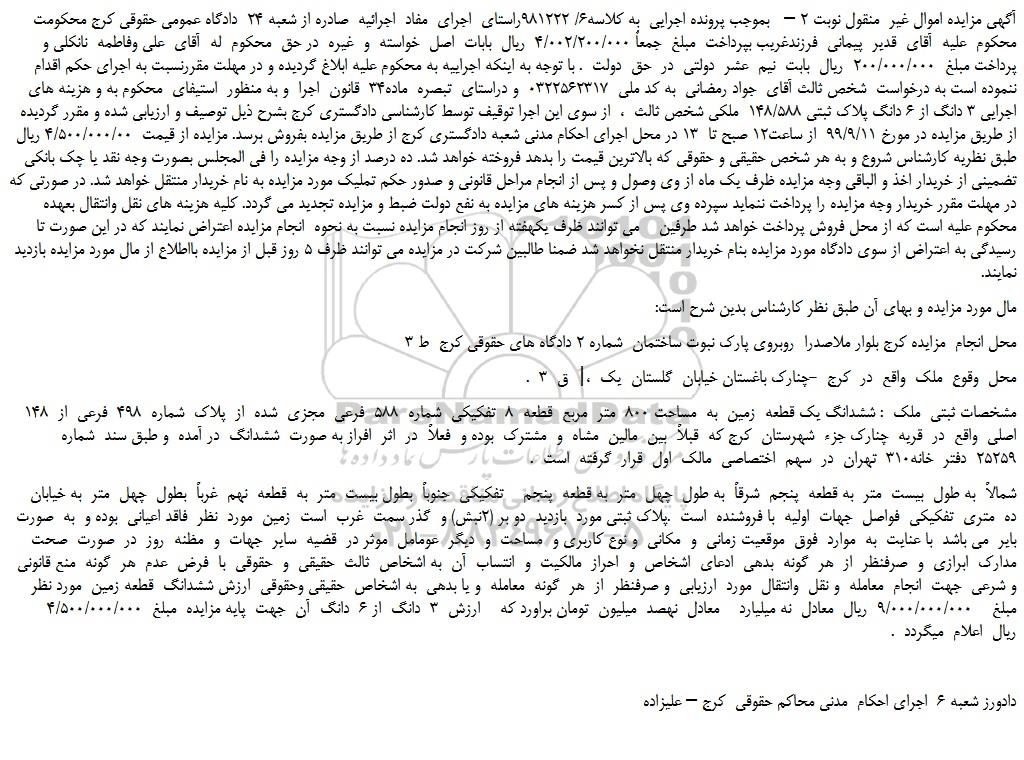 آگهی مزایده اموال غیر منقول نوبت 2 – بموجب پرونده اجرایی به کلاسه6/ 981222راستای اجرای مفاد اجرائیه صادره از شعبه 24 دادگاه عمومی حقوقی کرج محکومت محکوم علیه آقای قدیر پیمانی فرزندغریب بپرداخت مبلغ جمعاٌ 4/002/200/000 ریال بابات اصل خواسته و غیره در حق محکوم له آقای علی وفاطمه نانکلی و پرداخت مبلغ 200/000/000 ریال بابت نیم عشر دولتی در حق دولت . با توجه به اینکه اجراییه به محکوم علیه ابلاغ گردیده و در مهلت مقررنسبت به اجرای حکم اقدام ننموده است به درخواست شخص ثالث آقای جواد رمضانی به کد ملی 0322562317 و دراستای تبصره ماده34 قانون اجرا و به منظور استیفای محکوم به و هزینه های اجرایی 3 دانگ از 6 دانگ پلاک ثبتی 148/588 ملکی شخص ثالث ، از سوی این اجرا توقیف توسط کارشناسی دادگستری کرج بشرح ذیل توصیف و ارزیابی شده و مقرر گردیده از طریق مزایده در مورخ 99/9/11 از ساعت12 صبح تا 13 در محل اجرای احکام مدنی شعبه دادگستری کرج از طریق مزایده بفروش برسد. مزایده از قیمت 4/500/000/00 ریال طبق نظریه کارشناس شروع و به هر شخص حقیقی و حقوقی که بالاترین قیمت را بدهد فروخته خواهد شد. ده درصد از وجه مزایده را فی المجلس بصورت وجه نقد یا چک بانکی تضمینی از خریدار اخذ و الباقی وجه مزایده ظرف یک ماه از وی وصول و پس از انجام مراحل قانونی و صدور حکم تملیک مورد مزایده به نام خریدار منتقل خواهد شد. در صورتی که در مهلت مقرر خریدار وجه مزایده را پرداخت ننماید سپرده وی پس از کسر هزینه های مزایده به نفع دولت ضبط و مزایده تجدید می گردد. کلیه هزینه های نقل وانتقال بعهده محکوم علیه است که از محل فروش پرداخت خواهد شد طرفین می توانند ظرف یکهفته از روز انجام مزایده نسبت به نحوه انجام مزایده اعتراض نمایند که در این صورت تا رسیدگی به اعتراض از سوی دادگاه مورد مزایده بنام خریدار منتقل نخواهد شد ضمنا طالبین شرکت در مزایده می توانند ظرف 5 روز قبل از مزایده بااطلاع از مال مورد مزایده بازدید نمایند.