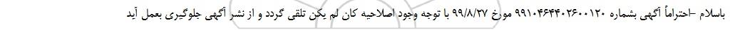 باسلام -احتراماً آگهی بشماره 9910464402600120 مورخ 99/8/27 با توجه وجود اصلاحیه کان لم یکن تلقی گردد و از نشر آگهی جلوگیری بعمل آید