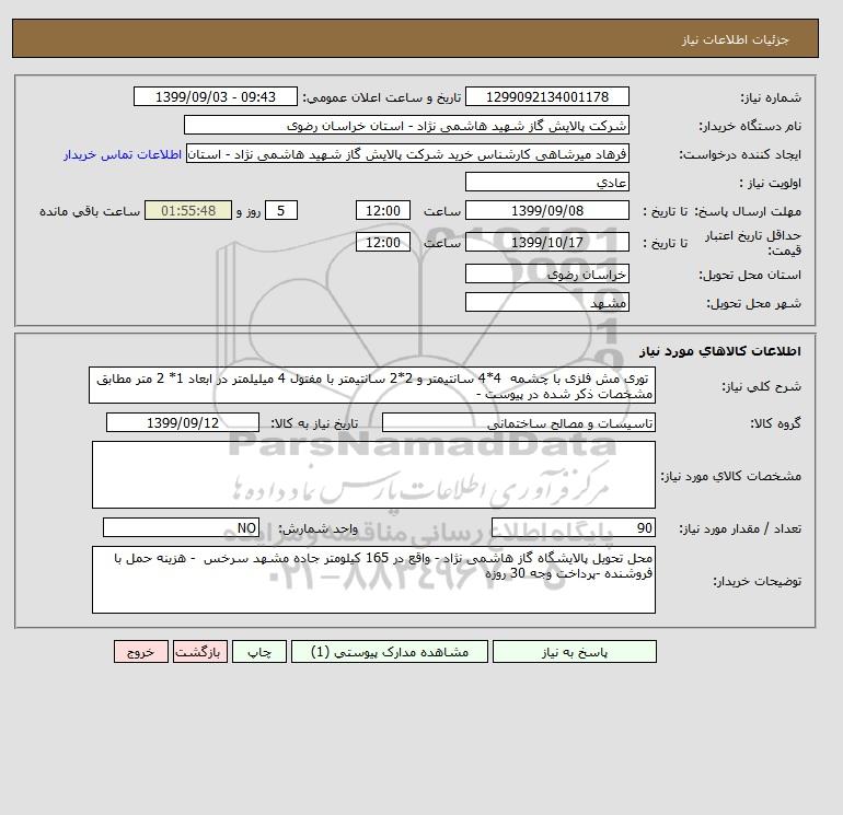 نام دستگاه خریدار:شرکت پالایش گاز شهید هاشمی نژاد - استان خراسان رضوی