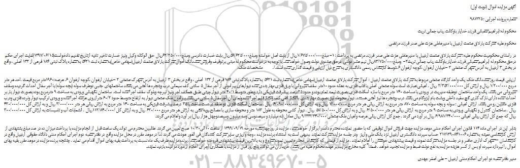 در راستای محکومیت محکوم علیه: شرکت پارلاق صنعت اردبیل با مدیرعاملی عزت علی صدر فرزند مرتضی به پرداخت : 1- مبلغ1/675/000/000ریال از بابت اصل خواسته ومبلغ56/625/000ریال بابت خسارت دادرسی ومبلغ62/250/000ریال حق الوکاله وکیل ونیز خسارت تاخیر تادیه ازتاریخ تقدیم دادخواست(1397/06/15)لغایت اجرای حکم درحق محکوم له ابراهیم شعبانی فرزند خدایار باوکالت رباب جمالی تریت2- ومبلغ83/750/000ریال نیم عشر دولتی درحق صندوق دولت وصول خواهد شد. با توجه به درخواست محکوم له مبنی برتوقیف وفروش ششدانگ اموال شرکت پارلاق صنعت اردبیل(سهامی خاص)به شماره ثبت 5421 به شماره پلاک ثبتی 184 فرعی از 132 اصلی ، واقع در بخش 3 اردبیل به آدرس شهرک صنعتی 2 -خیابان ارغوان ،کوچه ارغوان 6.،توسط کارشناس رسمی دادگستری به شرح ذیل ارزیابی و قیمت گذاری شده است./. مشخصات ملک: