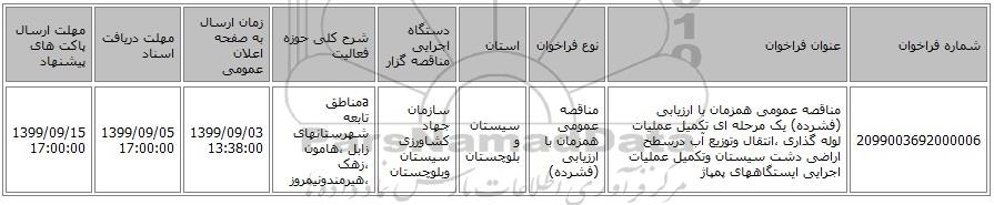 2099003692000006مناقصه عمومی همزمان با ارزیابی (فشرده) یک مرحله ای تکمیل عملیات لوله گذاری ،انتقال وتوزیع آب درسطح اراضی دشت سیستان وتکمیل عملیات اجرایی ایستگاههای پمپاژ مناقصه عمومی همزمان با ارزیابی (فشرده)سیستان و بلوچستانسازمان جهاد کشاورزی سیستان وبلوچستان aمناطق تابعه شهرستانهای زابل ،هامون ،زهک ،هیرمندونیمروز1399/09/03 13:38:001399/09/05 17:00:001399/09/15 17:00:00