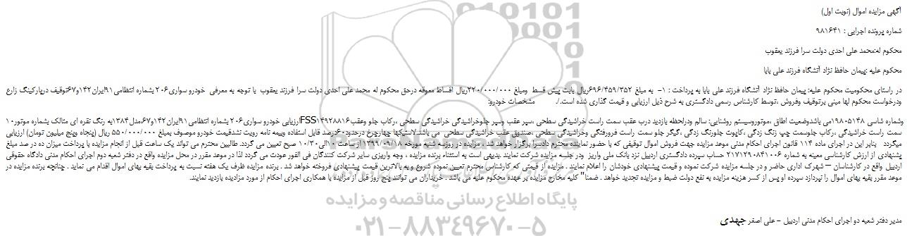 ارزیابی خودرو سواری206 بشماره انتظامی91ایران142و67،مدل1384به رنگ نقره ای متالک بشماره موتور10FSS14928816وشماره شاسی 19805148می باشدوضعیت اطاق ،موتوروسیستم روشنایی: سالم ودرلحظه بازدید درب عقب سمت راست خراشیدگی سطحی ،سپر عقب وسپر جلوخراشیدگی خراشیدگی سطحی ،رکاب جلو وعقب سمت راست خراشیدگی ،رکاب جلوسمت چپ زنگ زدگی ،کاپوت جلورنگ زدگی ،گیگر جلو سمت راست فرورفتگی وخراشیدگی سطحی ،صندوق عقب خراشیدگی سطحی می باشد.لاستیکها چهارچرخ درحدود60درصد قابل استفاده وبیمه نامه رویت نشدقیمت خودرو موصوف بمبلغ 550/000/000 ریال (پنجاه وپنج میلیون تومان) ارزیابی میگردد بنابر این در اجرای ماده 114 قانون اجرای احکام مدنی موعد مزایده جهت فروش اموال توقیفی که با حضور نماینده محترم دادسرا برگزار خواهد شد ، مزایده در روزسه شنبه مورخه 1399/09/18 از ساعت 10الی10/30 صبح تعیین می گردد. طالبین محترم می تواند یک ساعت قبل از انجام مزایده با پرداخت میزان ده در صد مبلغ پشنهادی از ارزش کارشناسی معینه به شماره 2171290841006 حساب سپرده دادگستری اردبیل نزد بانک ملی واریز ودر جلسه مزایده شرکت نمایند .بدیهی است به استثناء برنده مزایده ، وجه واریزی سایر شرکت کنندگان فی الفور عودت می گردد لذا در موعد مقرر در محل مزایده واقع در دفتر شعبه دوم اجرای احکام مدنی دادگاه حقوقی اردبیل واقع در کارشناسان – شهرک اداری حاضر و در جلسه مزایده شرکت نموده و قیمت پیشنهادی خودشان را اعلام نمایند . مزایده از قیمتی که کارشناس محترم تعیین نموده شروع و به بالاترین قیمت پیشنهادی فروخته خواهد شد . برنده مزایده ظرف یک هفته نسبت به پرداخت بقیه بهای اموال اقدام می نماید . چنانچه برنده مزایده در موعد مقرر بقیه بهای اموال را نپردازد سپرده او پس از کسر هزینه مزایده به نفع دولت ضبط و مزایده تجدید خواهد . ضمنا" کلیه مخارج مزایده بر عهده محکوم علیه می باشد . خریداران می توانند پنج روز قبل از مزایده با همکاری اجرای احکام از مورد مزادیده بازدید نمایند.