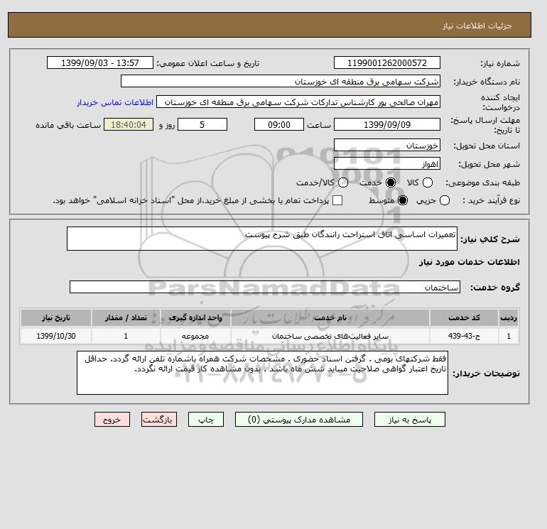 شرح کلی نیاز: تعمیرات اساسی اتاق استراحت رانندگان طبق شرح پیوست