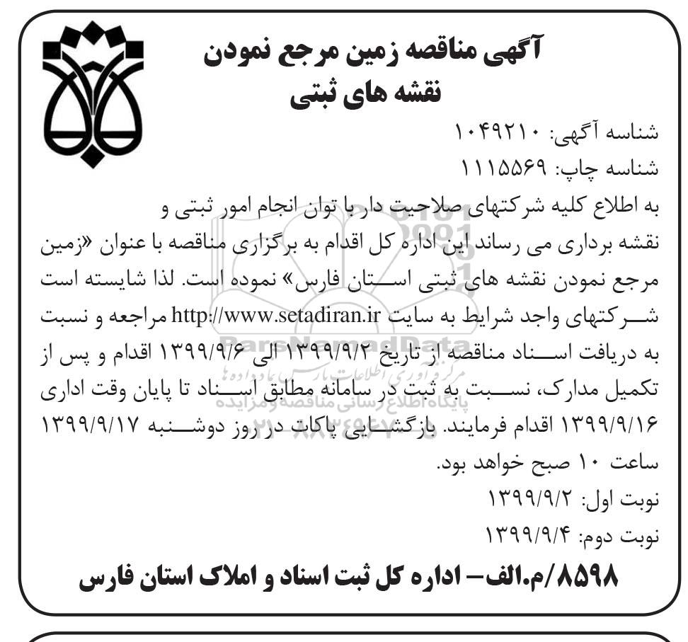 مناقصه زمین مرجع نمودن نقشه های ثبتی - نوبت دوم از کلیه افراد متخصص و شرکتها واجد شرایط دعوت به عمل میآید در مناقصه با کد خبرگزاری پارس نماد: 2909507 شرکت نمایند.