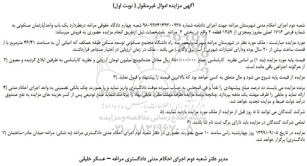 شعبه دوم اجرای احکام مدنی شهرستان مراغه جهت اجرای دادنامه شماره 9809974149300938 شعبه چهارم دادگاه حقوقی مراغه درنظردارد یک باب واحدآپارتمان مسکونی به شماره فرعی 1716 اصلی مفروز ومجزی از 1259 قطعه 2 واقع در بخش 3 مراغه بامشخصات ذیل ازطریق انجام مزایده حضوری به فروش میرساند: