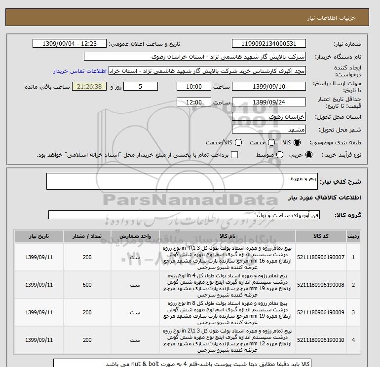 نام دستگاه خریدار:شرکت پالایش گاز شهید هاشمی نژاد - استان خراسان رضوی