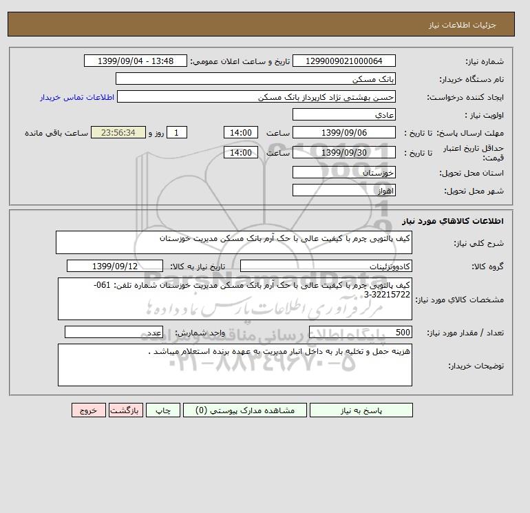 استعلام کیف پالتویی چرم با کیفیت عالی با حک آرم بانک مسکن مدیریت خوزستان, استعلام کیف پالتویی چرم با کیفیت عالی با حک آرم بانک مسکن مدیریت خوزستان