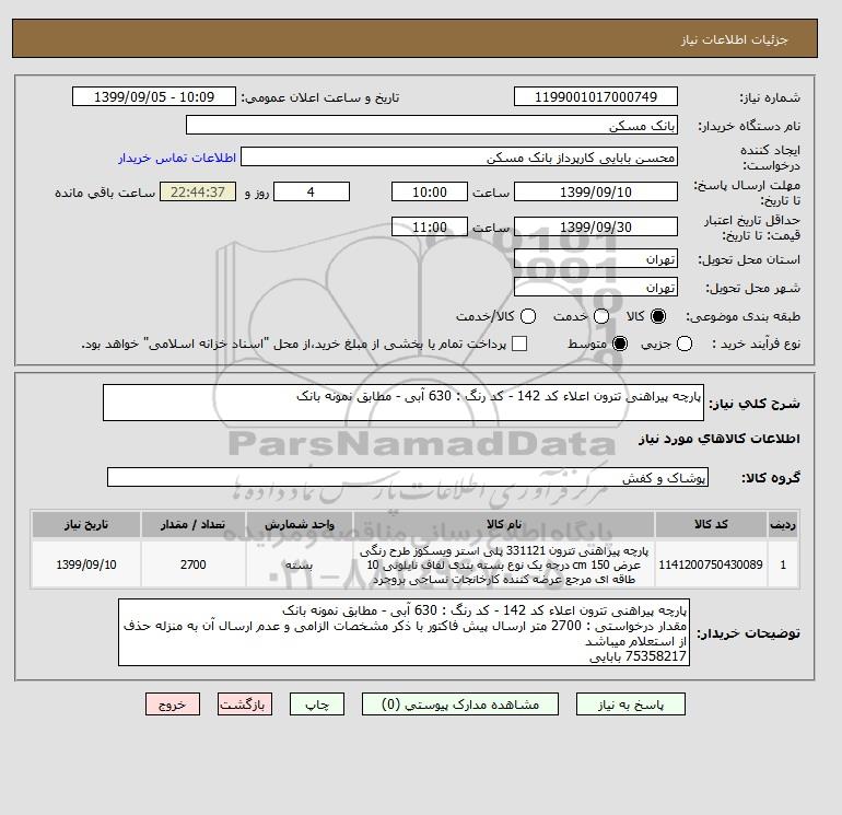 شرح کلی نیاز: پارچه پیراهنی تترون اعلاء کد 142 - کد رنگ : 630 آبی - مطابق نمونه بانک