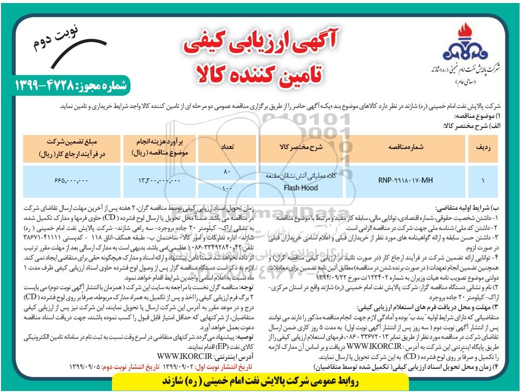 شرکت پالایش نفت امام خمینی (ره) شازند در نظر دارد کالاهای موضوع بند یک آگهی حاضر را از طریق برگزاری مناقصه عمومی دو مرحله ای از تامین کننده واجد شرایط خریداری و تامین نماید.