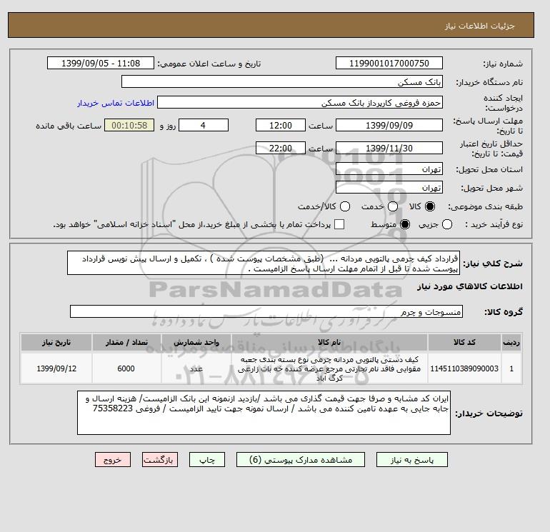 شرح کلی نیاز: قرارداد کیف چرمی پالتویی مردانه ... (طبق مشخصات پیوست شده ) ، تکمیل و ارسال پیش نویس قرارداد پیوست شده تا قبل از اتمام مهلت ارسال پاسخ الزامیست .