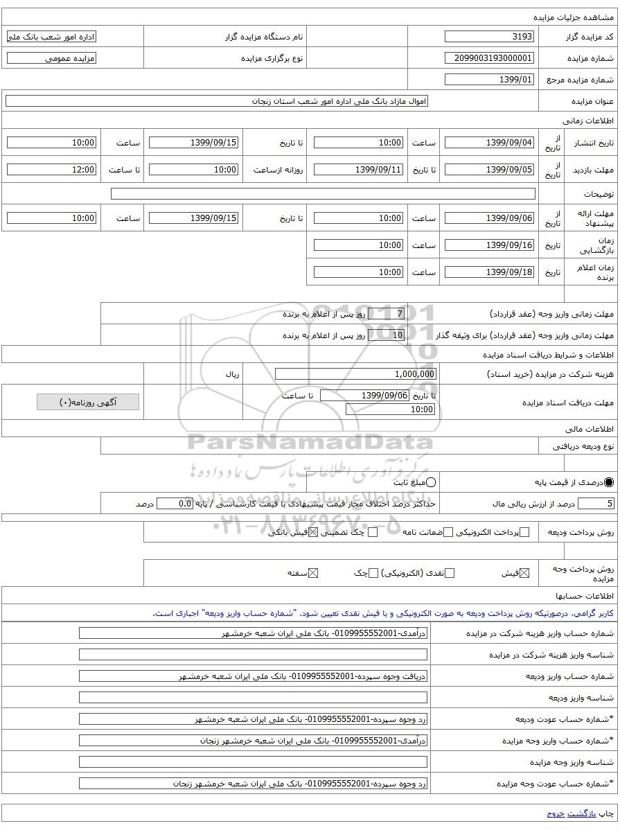 | شماره حساب واریز وجه مزایده | درآمدی-0109955552001- بانک ملی ایران شعبه خرمشهر زنجان |