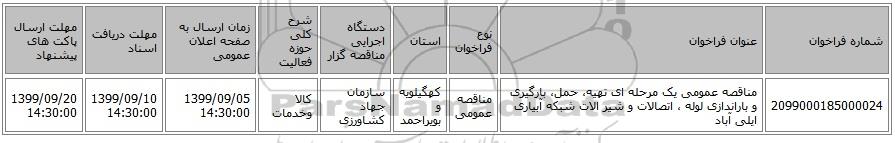 2099000185000024مناقصه عمومی یک مرحله ای تهیه، حمل، بارگیری و باراندازی لوله ، اتصالات و شیر الات شبکه آبیاری ایلی آباد مناقصه عمومیکهگیلویه و بویراحمدسازمان جهاد کشاورزیکالا وخدمات 1399/09/05 14:30:001399/09/10 14:30:001399/09/20 14:30:00
