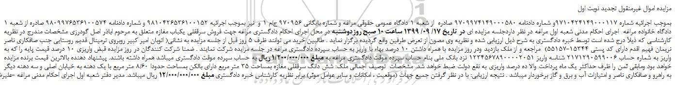 مزایده اموال غیرمنقول تجدید نوبت اول