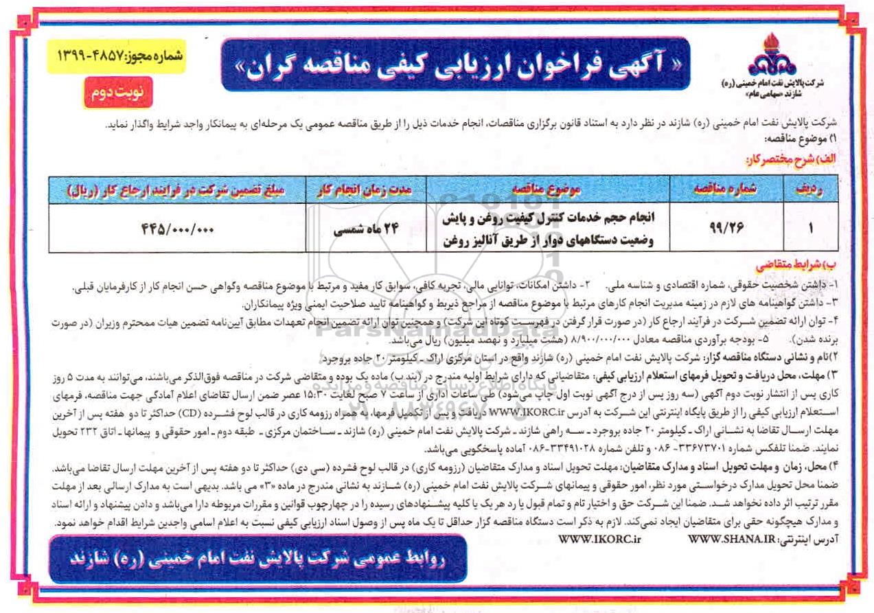 | 99/26 | انجام حجم خدمات کنترل کیفیت روغن و پایش وضعیت دستگاه های دوار از طریق آنالیز روغن | 24 ماه شمسی | 445.000.000 |