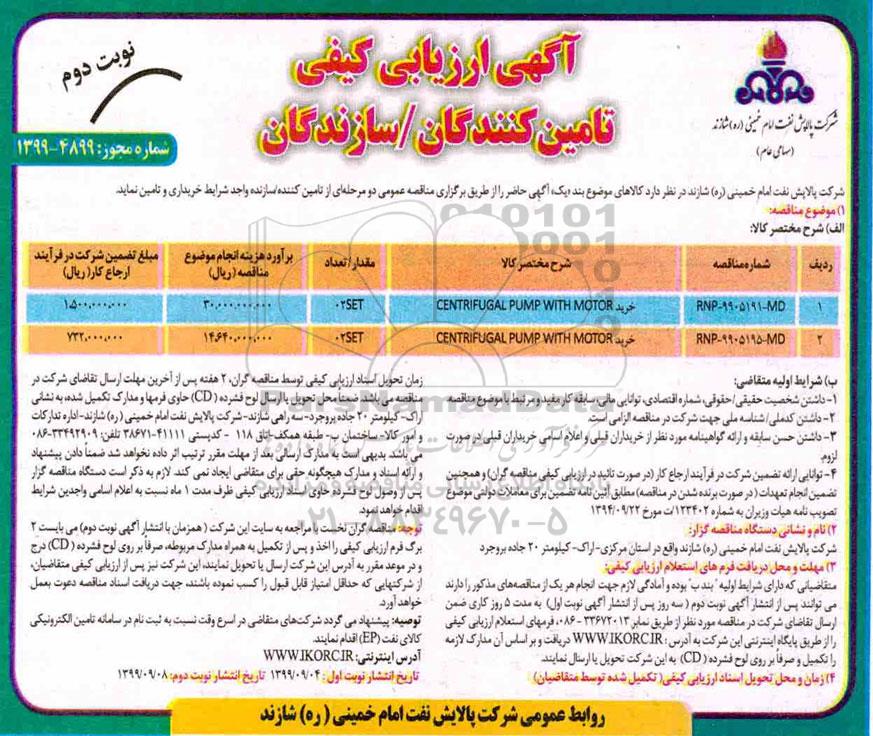 | 1 | RNP-9905191- MD | خرید CENTRIFUGAL PUMP WITH MOTOR | 02SET | 30.000.000.000 | 1.500.000.000 |