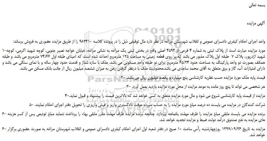 1-مورد مزایده عبارت است از پلاک ثبتی به شماره 4 فرعی از 4593 اصلی واقع در بخش ثبتی یک مراغه به نشانی مراغه، خیابان خواجه نصیر جنوبی، کوچه شهید اکرمی، کوچه شهید اژدرپور، پلاک 7  طبقه اول پلاک مذبور می باشد که بر روی قطعه زمینی به مساحت 125 مترمربع احداث شده است. که اعینای طبقه اول 74/66 مترمربع می باشد. و طبقه همکف بصورت دو واحد پارکینگ به مساحت حدود 65/24 مترمربع برای دو طبقه واحد مسکونی می باشد. ملک با سازه شناژ و قدمت حدود چهار ساله و با نمای سنگی می باشد و دارای امتیازات آب، گاز و برق متعلق به آقای محمد ساجدی می باشد.محدودیت ملک با درنظر گرفتن رهن به میزان ششصد میلیون ریال از جانب بانک مسکن می باشد.