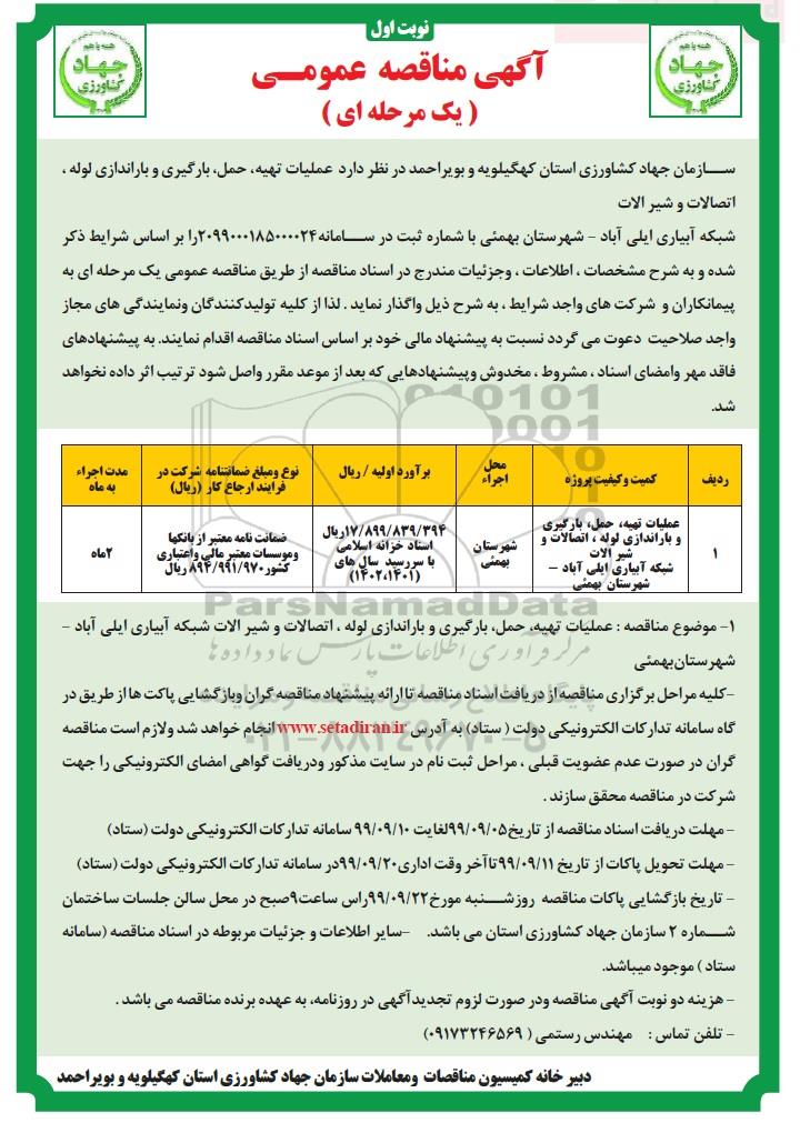 1 عملیات تهیه، حمل، بارگیری و باراندازی لوله، اتصالات و شیرآلات شبکه آبیاری ایلی آباد - شهرستان بهمئی  شهرستان بهمئی 17.899.839.394 ریال اسناد خزانه اسلامی با سررسید سالهای 1401، 1402  ضمانت نامه معتبر از بانکها و موسسات معتبر مالی و اعتباری کشور 894.991.970 ریال  2 ماه