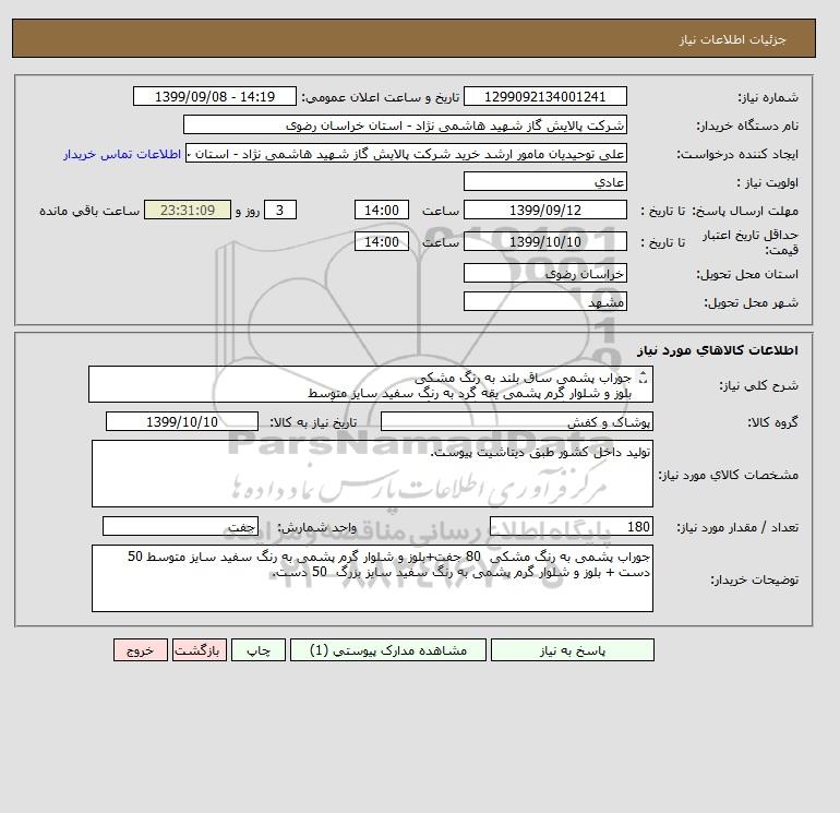 نام دستگاه خریدار:شرکت پالایش گاز شهید هاشمی نژاد - استان خراسان رضوی