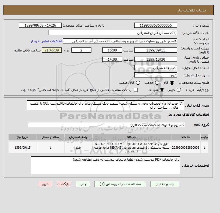شرح کلی نیاز: خرید لوازم و تجهیزات برقی و شبکه شعبه سهند بانک مسکن تبریز برابر فایلهایPDFپیوست ،کالا با کیفیت عالی ، ساخت ایران