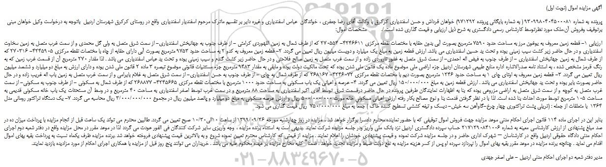 پرونده به شماره 9309980404500081 ( به شماره بایگانی پرونده 971292) خواهان قرداش و حسن اسفندیاری کرکرق با وکالت آقای رضا جعفری ، خواندگان عباس اسفندیاری و غیره دایر بر تقسیم ماترک مرحوم اسفندیار اسفندیاری واقع در روستای کرکرق شهرستان اردبیل باتوجه به درخواست وکیل خواهان مبنی برتوقیف وفروش آن،ملک مورد نظرتوسط کارشناس رسمی دادگستری به شرح ذیل ارزیابی و قیمت گذاری شده است./. مشخصات اموال: