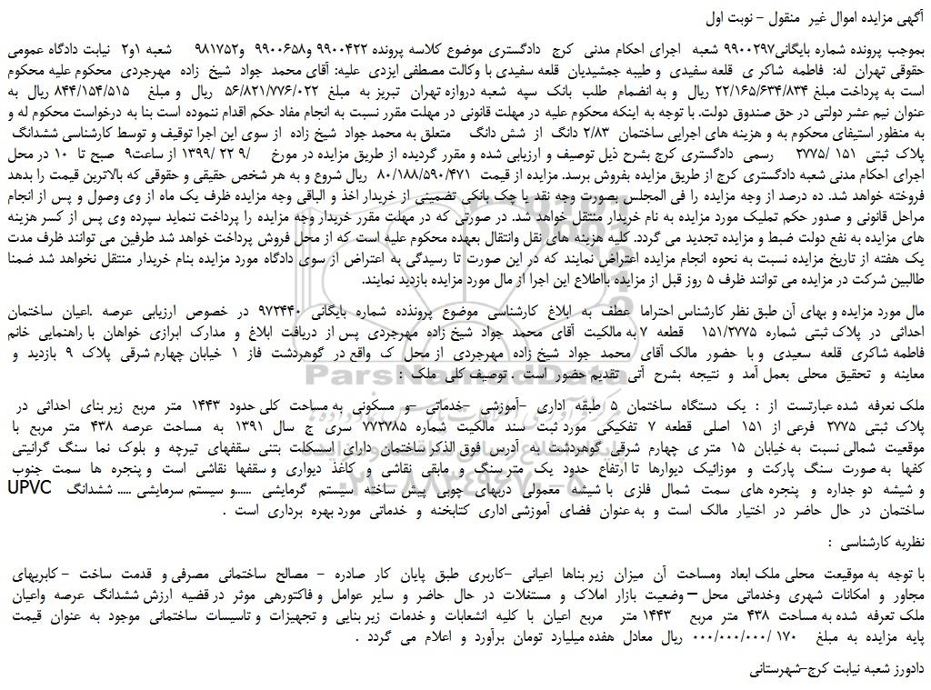 بموجب پرونده شماره بایگانی9900297 شعبه  اجرای احکام مدنی  کرج  دادگستری موضوع کلاسه پرونده 9900422 و9900658  و981752    شعبه 1و2  نیابت دادگاه عمومی حقوقی تهران  له:  فاطمه  شاکر ی  قلعه سفیدی  و طیبه جمشیدیان  قلعه سفیدی با وکالت مصطفی ایزدی  علیه: آقای محمد  جواد  شیخ  زاده  مهرجردی  محکوم علیه محکوم است به پرداخت مبلغ 22/165/634/834 ریال  و به انضمام  طلب  بانک  سپه  شعبه دروازه تهران  تبریز به  مبلغ  56/821/776/022  ریال  و مبلغ    844/154/515 ریال  به عنوان نیم عشر دولتی در حق صندوق دولت. با توجه به اینکه محکوم علیه در مهلت قانونی در مهلت مقرر نسبت به انجام مفاد حکم اقدام ننموده است بنا به درخواست محکوم له و به منظور استیفای محکوم به و هزینه های اجرایی ساختمان  2/83 دانگ  از  شش دانگ    متعلق به محمد جواد  شیخ زاده  از سوی این اجرا توقیف و توسط کارشناسی ششدانگ  پلاک ثبتی  151 /2775    رسمی  دادگستری کرج بشرح ذیل توصیف و ارزیابی شده و مقرر گردیده از طریق مزایده در مورخ    /9 22 /1399 از ساعت9  صبح تا  10 در محل اجرای احکام مدنی شعبه دادگستری کرج از طریق مزایده بفروش برسد. مزایده از قیمت  80/188/590/471  ریال شروع و به هر شخص حقیقی و حقوقی که بالاترین قیمت را بدهد فروخته خواهد شد. ده درصد از وجه مزایده را فی المجلس بصورت وجه نقد یا چک بانکی تضمینی از خریدار اخذ و الباقی وجه مزایده ظرف یک ماه از وی وصول و پس از انجام مراحل قانونی و صدور حکم تملیک مورد مزایده به نام خریدار منتقل خواهد شد. در صورتی که در مهلت مقرر خریدار وجه مزایده را پرداخت ننماید سپرده وی پس از کسر هزینه های مزایده به نفع دولت ضبط و مزایده تجدید می گردد. کلیه هزینه های نقل وانتقال بعهده محکوم علیه است که از محل فروش پرداخت خواهد شد طرفین می توانند ظرف مدت یک هفته از تاریخ مزایده نسبت به نحوه انجام مزایده اعتراض نمایند که در این صورت تا رسیدگی به اعتراض از سوی دادگاه مورد مزایده بنام خریدار منتقل نخواهد شد ضمنا طالبین شرکت در مزایده می توانند ظرف 5 روز قبل از مزایده بااطلاع این اجرا از مال مورد مزایده بازدید نمایند.
