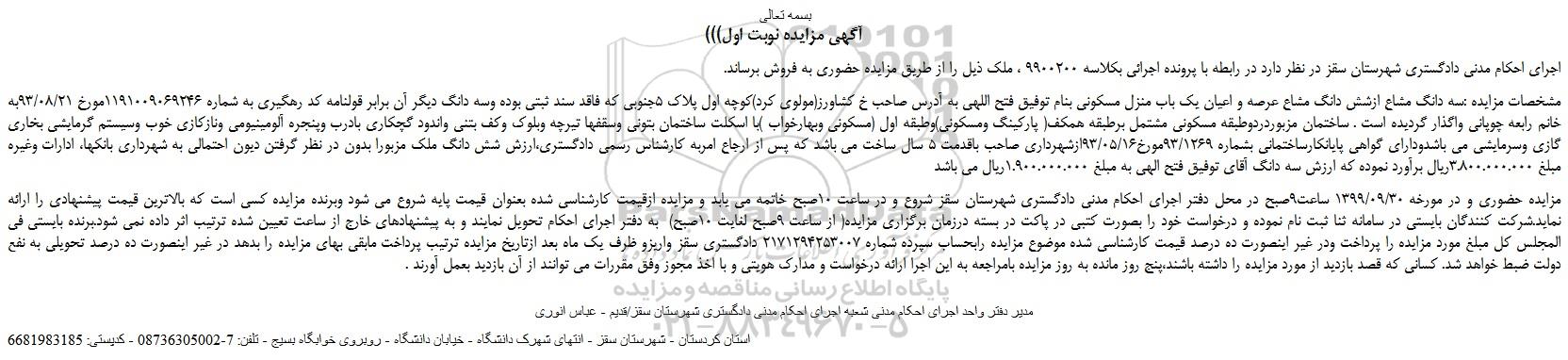 اجرای احکام مدنی دادگستری شهرستان سقز در نظر دارد در رابطه با پرونده اجرائی بکلاسه 9900200 ، ملک ذیل را از طریق مزایده حضوری به فروش برساند.