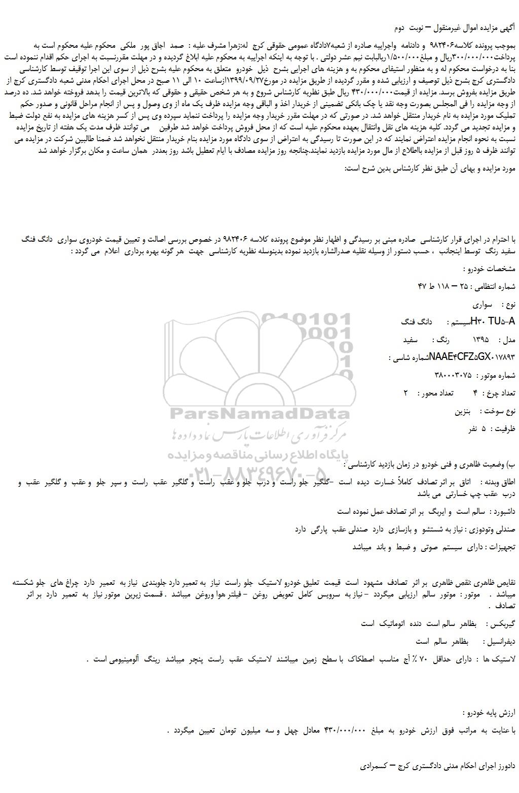 بموجب پرونده کلاسه982406 و دادنامه واجراییه صادره از شعبه7دادگاه عمومی حقوقی کرج له:زهرا مشرف علیه : صمد اجاق پور ملکی محکوم علیه محکوم است به پرداخت300/000/000ریال و مبلغ1/500/000ریالبابت نیم عشر دولتی . با توجه به اینکه اجراییه به محکوم علیه ابلاغ گردیده و در مهلت مقررنسبت به اجرای حکم اقدام ننموده است بنا به درخواست محکوم له و به منظور استیفای محکوم به و هزینه های اجرایی بشرح ذیل خودرو متعلق به محکوم علیه بشرح ذیل از سوی این اجرا توقیف توسط کارشناسی دادگستری کرج بشرح ذیل توصیف و ارزیابی شده و مقرر گردیده از طریق مزایده در مورخ1399/09/27ازساعت 10 الی 11 صبح در محل اجرای احکام مدنی شعبه دادگستری کرج از طریق مزایده بفروش برسد. مزایده از قیمت430/000/000 ریال طبق نظریه کارشناس شروع و به هر شخص حقیقی و حقوقی که بالاترین قیمت را بدهد فروخته خواهد شد. ده درصد از وجه مزایده را فی المجلس بصورت وجه نقد یا چک بانکی تضمینی از خریدار اخذ و الباقی وجه مزایده ظرف یک ماه از وی وصول و پس از انجام مراحل قانونی و صدور حکم تملیک مورد مزایده به نام خریدار منتقل خواهد شد. در صورتی که در مهلت مقرر خریدار وجه مزایده را پرداخت ننماید سپرده وی پس از کسر هزینه های مزایده به نفع دولت ضبط و مزایده تجدید می گردد. کلیه هزینه های نقل وانتقال بعهده محکوم علیه است که از محل فروش پرداخت خواهد شد طرفین می توانند ظرف مدت یک هفته از تاریخ مزایده نسبت به نحوه انجام مزایده اعتراض نمایند که در این صورت تا رسیدگی به اعتراض از سوی دادگاه مورد مزایده بنام خریدار منتقل نخواهد شد ضمنا طالبین شرکت در مزایده می توانند ظرف 5 روز قبل از مزایده بااطلاع از مال مورد مزایده بازدید نمایند.چنانجه روز مزایده مصادف با ایام تعطیل باشد روز بعددر همان ساعت و مکان برگزار خواهد شد