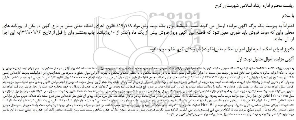 به موجب پرونده کلاسه 984569 صادره از شعبه 7 دادگاه عمومی خانواده کرج لها: خانم زهرا اهرائی یانبلاغ فرزند قوچعلی محکوم علیه محکوم است به پرداخت مهریه به میزان 500 عدد سکه تمام بهار آزادی در حق محکوم لها و مبلغ پنج درصدازهزینه اجرایی با توجه به اینکه اجرائیه صادره به محکوم علیه ابلاغ شده ودر مهلت مقرر نسبت به اجرای حکم اقدام ننموده است بنا به در خواست محکوم له به منظور استیفای محکوم به وهزینه اجرایی اموال متعلق به نامبرده می باشد،ازسوی این اجراتوقیف وتوسط کارشناس رسمی دادگستری به شرح زیر توصیف وارزیابی شده ومقرر است در مورخ 1399/09/16از ساعت 9 الی10 در محل اجرای احکام مجتمع خانواده از طریق مزایده بفروش می رسد، مزایده ازمبلغ 1500000000 ریال نظریه کارشناسی شروع می شود وبه هر شخص حقیقی وحقوقی که بالاترین قیمت را پیشنهاد نماید فروخته خواهد شد ده درصد وجه مزایده فی المجلس بصورت وجه نقد یا چک بانکی تضمینی از خریدار اخذ والباقی ظرف یک هفته از وی وصول خواهد شد وپس از انجام مراحل قانونی وصدور حکم تملیک مورد مزایده بنام خریدار منتقل خواهد شد در صورتیکه در مهلت مقرر خریدار وجه مزایده را پرداخت ننماید سپرده وی پس از کسر هزینه های مزایده به نفع دولت ضبط ومزایده تجدید می گرددکلیه هزینه های نقل وانتقال به عهده محکوم علیه است واز محل فروش پرداخت خواهد شد .طرفین می توانند ظرف یک هفته از تاریخ مزایده نسبت به نحوه انجام مزایده اعتراض نمایند که در این صورت تا رسیدگی به اعتراض از سوی دادگاه مورد مزایده به نام خریدار منتقل نخواهد شد ضمنا طالبین به شرکت در مزایده می توانند ظرف پنج روز قبل از مزایده با اطلاع این اجرا از مال مورد مزایده بازدید نمایند چنانچه روز مزایده مصادف با ایام تعطیل باشد روز بعد در همان ساعت ومکان برگزار خواهد شد . مال مورد مزایده وبهای آن طبق نظر کارشناس بدین شرح است: یک دستگاه خودرو سواری برلیانس H 330مدل 1395 به شماره انتظامی 239س 81 ایران 38 می باشد. سپرهای جلو و عقب بر روی خودرو نصب نمی باشد آثار ضربه و تصادف بر روی دیاق سپر عقب و جلو و درب موتور مشاهده می شود شیشه جلو دارای ترک و شکستگی می باشد مابقی شیشه ها و آینه ها سالم است .لاستیک ها در حدود 60درصد سالم است؛آثار ضربه بر روی درب صندوق عقب مشاهده می شود در اطراف بدنه خط و خش وجود دارد؛ رکاب سمت راست خوردگی دارد مدل خودرو H330 AT دنده اتومات ، روکش صندلی مستعمل، دارای ساتروف و سیستم ضبط و پخش است.در زمان بازدید از خودرو سوئیج موجود نبود لذا امکان بررسی فنی (موتوری) و بررسی کیلومتر کارکرد میسر نگردید همچنین بدلیل در دسترس نبودن مدارک خودرو مشخص نیست مدت زمان باقیمانده شخص ثالث این خودرو چه زمانی است . با این تفاسیر قیمت پایه کارشناسی با توجه به قیمت بازار 1500000000 ریال معادل یکصدوپنجاه میلیون تومان تعیین می گردد./