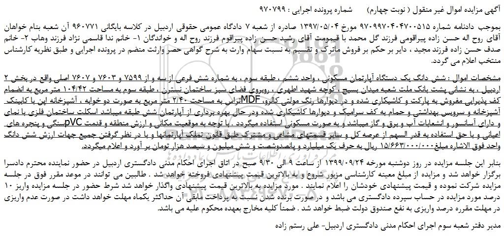 بموجب دادنامه شماره 9709970404700515 مورخ 1397/05/04 صادره از شعبه 7 دادگاه عمومی حقوقی اردبیل در کلاسه بایگانی 960771 آن شعبه بنام خواهان آقای روح اله حسن زاده پیراقومی فرزند گل محمد با قیمومت آقای رشید حسن زاده پیراقوم فرزند روح اله و خواندگان 1- خانم ندا قاسمی نژاد فرزند وهاب 2- خانم صدف حسن زاده فرزند مجید ، دایر بر حکم بر فروش ماترک و تقسیم به نسبت سهام وارث به شرح گواهی حصر وارثت منضم در پرونده اجرایی و طبق نظریه کارشناس منتخب اعلام می گردد.