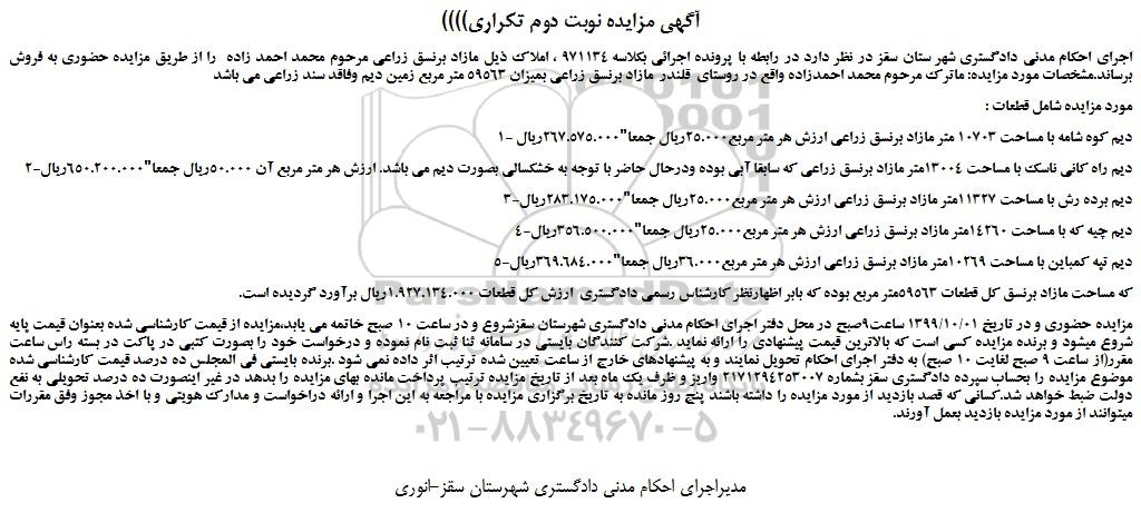 اجرای احکام مدنی دادگستری شهر ستان سقز در نظر دارد در رابطه با پرونده اجرائی بکلاسه 971134 ، املاک ذیل مازاد برنسق زراعی مرحوم محمد احمد زاده  را از طریق مزایده حضوری به فروش برساند.مشخصات مورد مزایده: ماترک مرحوم محمد احمدزاده واقع در روستای  قلندر  مازاد برنسق زراعی بمیزان 59563 متر مربع زمین دیم وفاقد سند زراعی می باشد