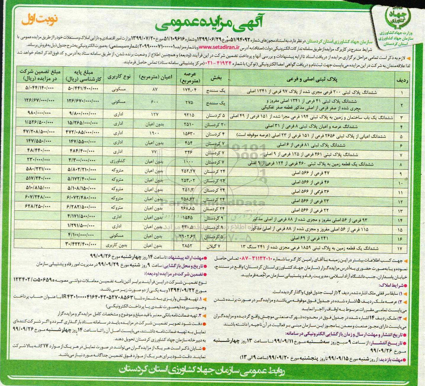 مزایده عمومی مزایده فروش املاک و مستغلات کاربری مسکونی و کشاورزی نوبت اول برگزار میگردد. از کلیه افراد متخصص و شرکتهای واجد شرایط دعوت به عمل میآید تا در این مزایده با کد خبرگزاری پارس نماد : 2921568 شرکت نمایند تاریخ شروع مزایده : 1399/09/09 مهلت شرکت در مزایده: تا پایان روز 1399/09/26 مکان برگزاری اموال واگذاری استانهای مزایدات استان کردستان و دستهبندیهای مربوط به این حراجی املاک و زمین میباشد.