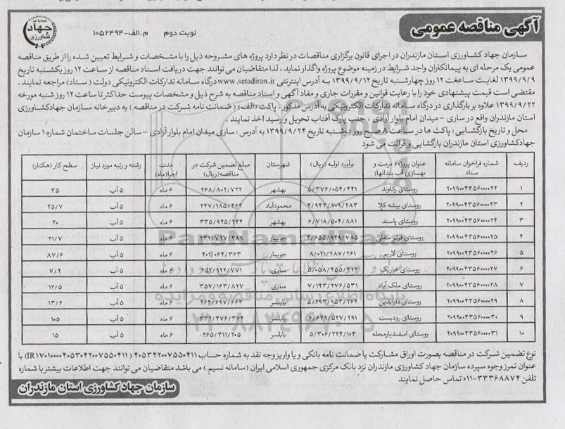 سازمان جهاد کشاورزی استان مازندران در اجرای قانون برگزاری مناقصات در نظر دارد پروژه های مشروحه ذیل را با مشخصات و شرایط تعیین شده را از طریق مناقصه عمومی یک مرحله ای به پیمانکاران واجد شرایط در زمینه موضوع پروژه واگذار نماید.