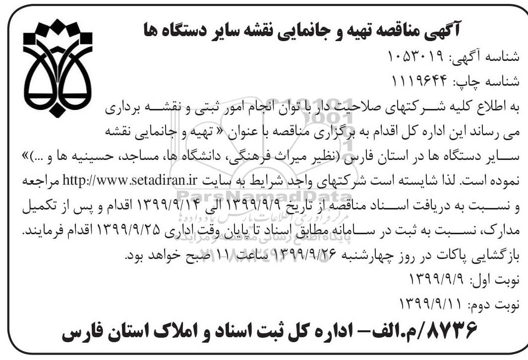 به اطلاع کلیه شرکتهای صلاحیت دار با توان انجام امور ثبتی و نقشه برداری می رساند این اداره کل اقدام به برگزاری مناقصه با عنوان تهیه و جانمایی نقشه سایر دستگاه ها در استان فارس (نظیر میراث فرهنگی، دانشگاه ها، مساجد، حسینیه ها و ...) نموده است لذا شایسته است شرکتهای واجد شرایط به سایت ستاد ایران مراجعه و نسبت به دریافت اسناد مناقصه از تاریخ 99.9.9 الی 99.9.14 اقدام و پس از تکمیل مدارک نسبت به ثبت در سامانه مطابق اسناد تا پایان وقت اداری 99.9.25 اقدام فرمایند بازگشایی پاکات در روز چهارشنبه 1399.09.26 ساعت 11 صبح خواهد بود