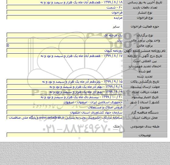 مزایده عمومی مزایده, فروش املاک و مستغلات برگزار میگردد. از کلیه افراد متخصص و شرکت‌های واجد شرایط دعوت به عمل می‌آید تا در این مزایده با کد خبرگزاری پارس نماد : 2922892 شرکت نمایند تاریخ شروع مزایده : 1399/09/09 مهلت شرکت در مزایده: تا پایان روز 1399/09/09 مکان برگزاری اموال واگذاری استان‌های مزایدات استان اصفهان و دسته‌بندی‌های مربوط به این حراجی املاک و زمین میباشد.