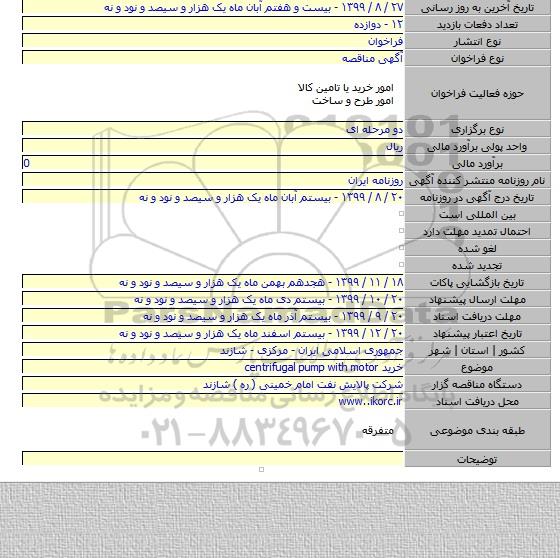 مناقصه, خرید centrifugal pump with motor از کلیه افراد متخصص و شرکتها واجد شرایط دعوت به عمل میآید در مناقصه با کد خبرگزاری پارس نماد: 2922982 شرکت نمایند.