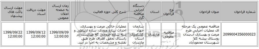 | 2099004356000023 | مناقصه عمومی یک مرحله ای عملیات اجرایی طرح مرمت و بهسازی آببندان روستای بیشه کلا شهرستان محمودآباد | مناقصه عمومی | مازندران | سازمان جهاد کشاورزی استان مازندران | عملیات خاکی مرمت و بهسازی، احداث سازه ورودی، سازه ارتباطی و سه سازه خروجی که میبایست در راستای تحقق اهداف طرح طبق نقشه و مشخصات به اجرا در آیند. | 1399/09/09 12:00:00 | 1399/09/12 12:00:00 | 1399/09/22 12:00:00 |