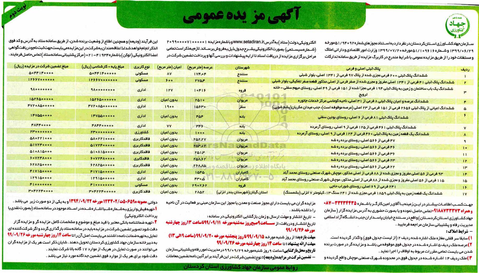 مزایده عمومی مزایده فروش پلاک ثبتی اصلی و فرعی برگزار میگردد. از کلیه افراد متخصص و شرکت‌های واجد شرایط دعوت به عمل می‌آید تا در این مزایده با کد خبرگزاری پارس نماد : 2924843 شرکت نمایند تاریخ شروع مزایده : 1399/09/10 مهلت شرکت در مزایده: تا پایان روز 1399/09/26 مکان برگزاری اموال واگذاری استان‌های مزایدات استان کردستان و دسته‌بندی‌های مربوط به این حراجی املاک و زمین میباشد.