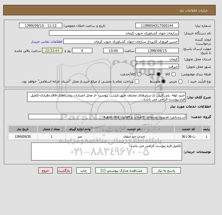 شرح کلی نیاز: خرید لوله پلی اتیلن در سایزهای مختلف طبق لیست پیوست -از محل اعتبارات روستاهای فاقددهیاری-تکمیل فرم پیوست الزامی می باشد.