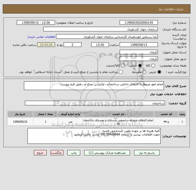 شرح کلی نیاز: انجام امور مربوط به کارهای داخلی ساختمان ، پارتیشن بندی و...طبق فرم پیوست