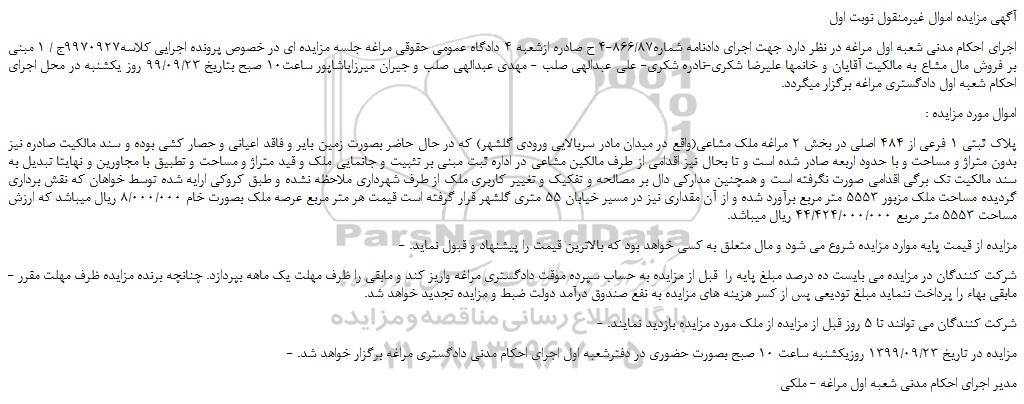اجرای احکام مدنی شعبه اول مراغه در نظر دارد جهت اجرای دادنامه شماره866/87-4 ح صادره ازشعبه 4 دادگاه عمومی حقوقی مراغه جلسه مزایده ای در خصوص پرونده اجرایی کلاسه9970927ج / 1 مبنی بر فروش مال مشاع به مالکیت آقایان و خانمها علیرضا شکری-نادره شکری- علی عبدالهی صلب - مهدی عبدالهی صلب و جیران میرزاپاشاپور ساعت10 صبح بتاریخ 99/09/23 روز یکشنبه در محل اجرای احکام شعبه اول دادگستری مراغه برگزار میگردد.