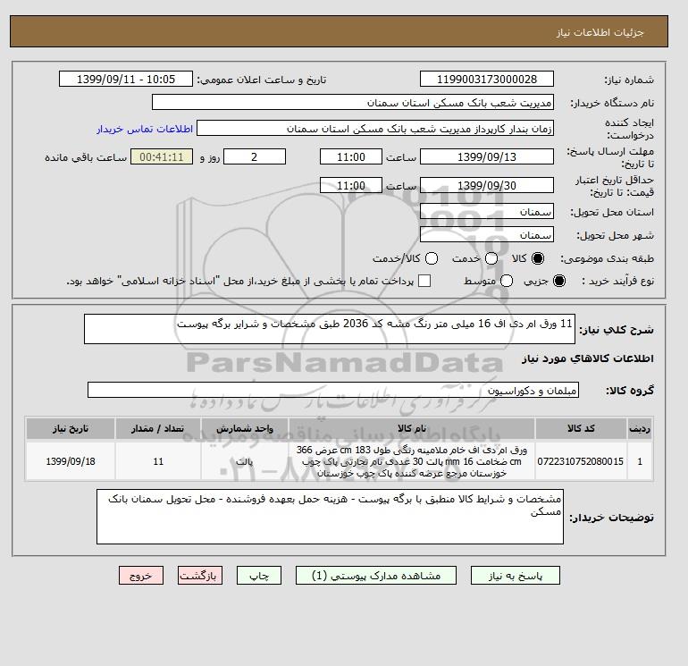 شرح کلی نیاز: 11 ورق ام دی اف 16 میلی متر رنگ مشه کد 2036 طبق مشخصات و شرایر برگه پیوست