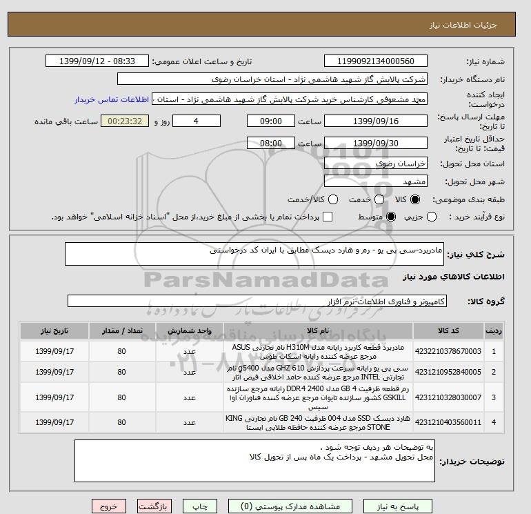 نام دستگاه خریدار:شرکت پالایش گاز شهید هاشمی نژاد - استان خراسان رضوی