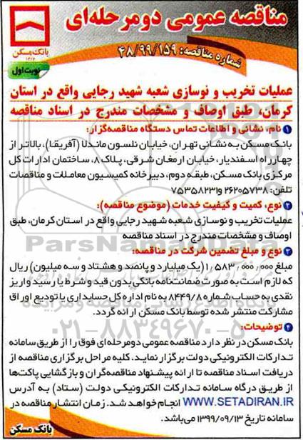 عملیات اجرایی تخریب و نوسازی شعبه شهید رجایی در استان کرمان طبق اوصاف و مشخصات مندرج در اسناد مناقصه (تجدید شده)