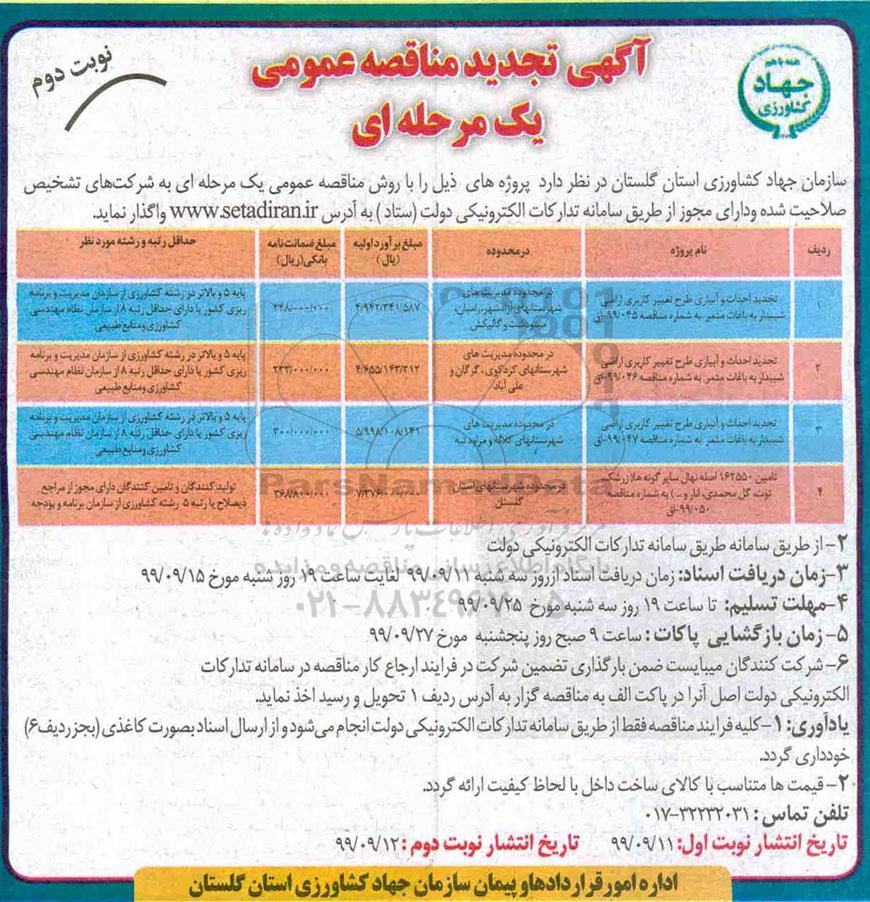 سازمان جهاد کشاورزی استان گلستان در نظر دارد پروژه های ذیل را با روش مناقصه عمومی یک مرحله ای به شرکت های تشخیص صلاحیت شده و دارای مجوز از طریق سامانه تدارکات الکترونیکی دولت ستاد واگذار نماید