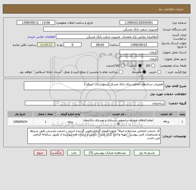 شرح کلی نیاز: تعمیرات ساختمان مامورسرای بانک مسکن(شهرستان جیرفت)