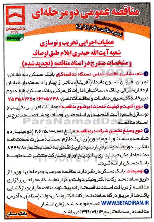 عملیات اجرایی تخریب و نوسازی شعبه آیت الله حیداری ایلام طبق اوصاف و مشخصات مندرج در اسناد مناقصه (تجدید شده)