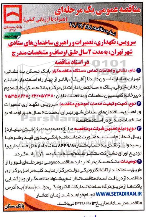 1. نام و نشانی و اطلاعات تماس دستگاه مناقصه گزار: بانک مسکن به نشانی تهران، خیابان نلسون ماندلا (آفریقا)، بالاتر از چهارراه اسفندیار، خیابان ارمغان شرقی، پلاک 8، ساختمان ادارات کل مرکزی بانک مسکن، طبقه دوم دبیرخانه کمیسیون معاملات و مناقصات تلفن: 26205738 و 75358228