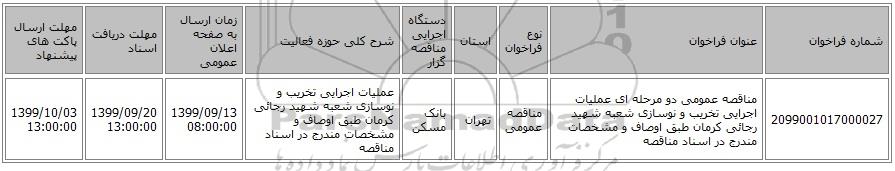 2099001017000027 | مناقصه عمومی دو مرحله ای عملیات اجرایی تخریب و نوسازی شعبه شهید رجائی کرمان طبق اوصاف و مشخصات مندرج در اسناد مناقصه | مناقصه عمومی | تهران | بانک مسکن | عملیات اجرایی تخریب و نوسازی شعبه شهید رجائی کرمان طبق اوصاف و مشخصات مندرج در اسناد مناقصه | 1399/09/13 08:00:00 | 1399/09/20 13:00:00 | 1399/10/03 13:00:00 |