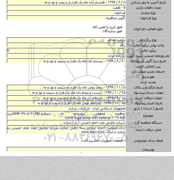 مناقصه عمومی دومرحله ای شماره RNP-۹۹۰۵۱۹۱-MDخرید Centil fugal pump with motor p-۲۰۲۹ A/B
